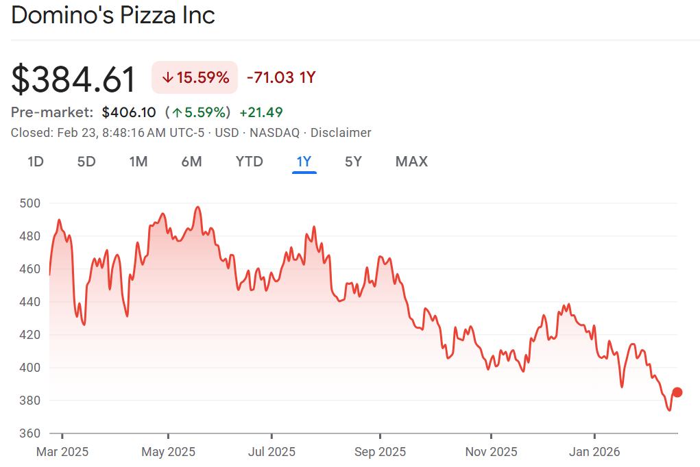 Stuffed crust: Shares of Domino’s are pumping after sales growth came in higher than expected. Profit was a little lighter and gross margins fell from last year. Keep in mind that the stock has languished so a little bit of good news is helping the stock. Remember, Berkshire Hathaway is the second largest shareholder owning just under 10% of the company. “As we look ahead to 2026, it is our expectation that we will meaningfully increase our market share within a U.S. (quick-serve restaurant) pizza category that continues to grow”