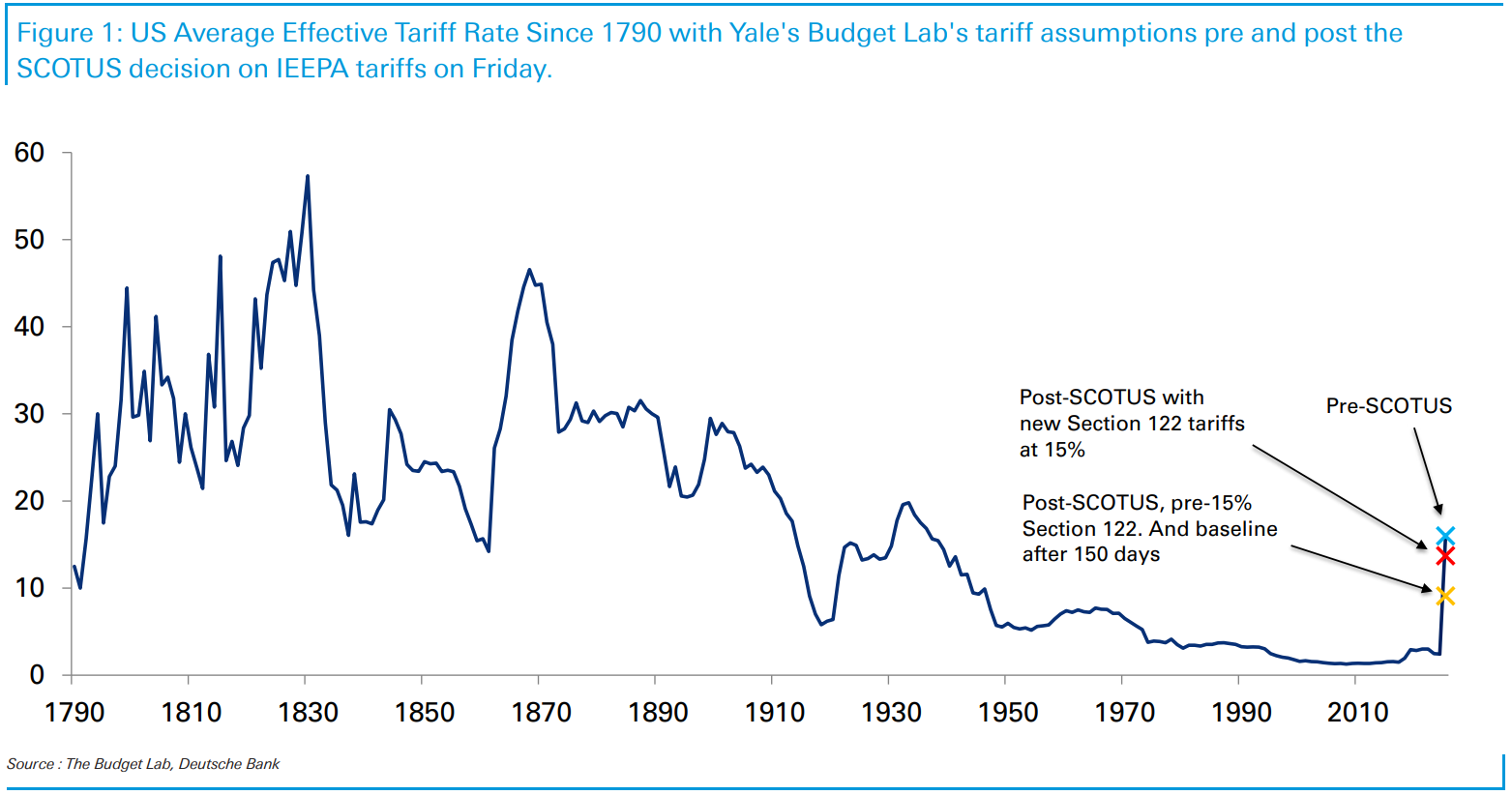 Whack-a-tariff: US futures are under pressure on the announcement of new tariffs after the US Supreme Court struck down tariffs enacted under emergency measures. Undaunted, US President Donald Trump announced he was hiking Section 122 tariffs (temporary tariffs up to 15% that can be placed by the President to address balance of payment issues). This boosts the average effective tariff rate in the US to 13.7% according to the Budget Lab at Yale, which is still lower than the 16% rate when the emergency tariffs were in place but higher than the 9% when they were struck down Friday (see chart below). It is unclear how this would affect countries that have trade deals or are negotiating trade deals. That uncertainty is contributing to market anxiety today. “The bottom line is that there’s a lot of noise and legal uncertainty but even allowing for a pivot toward Sections 232 and 301 to replace (emergency measures) over time,” wrote strategist Jim Reid at Deutsche Bank, “and with Section 122 likely temporary—the direction of travel still looks like a lower effective tariff rate in 2026.” Outside of tariffs, there are other items generating frown lines this morning. OpenAI increased its sales forecast for the next five years, but that comes along with a cash burn that was twice more than expected and gross margins which were 33% – well below the 46% expected. Airline stocks could be a mess today with no flights into New York because of weather and violent eruption in Puerto Vallarta halting air travel. Add in Cuba for Canadian airlines and there are a lot of headwinds for the sector recently.