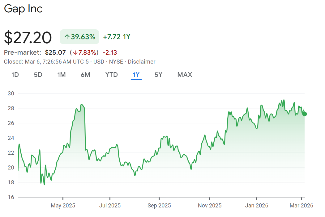 Mind the gap: Shares of Gap Inc are falling 8% after sales in some of its banners fell short of expectations. Sales at the namesake retailer, The Gap, surged 7% which was much better than the 4% expected. However, Old Navy (+3% vs 4.25% expected) and Athleta fell short (-10% vs -5% expected). Shares have been volatile over the past year but are up about 40% since the June low. The CEO said a turnaround in its Athleta brand would take time and warned that sales will likely still fall this year. The Old Navy miss is a bigger problem because that is their biggest brand right now. The company also had weaker margins than expected and warned Q1 could be softer. “We see risk that the promo environment intensifies,” wrote Citi’s Paul Lejuez who is neutral on the stock.
