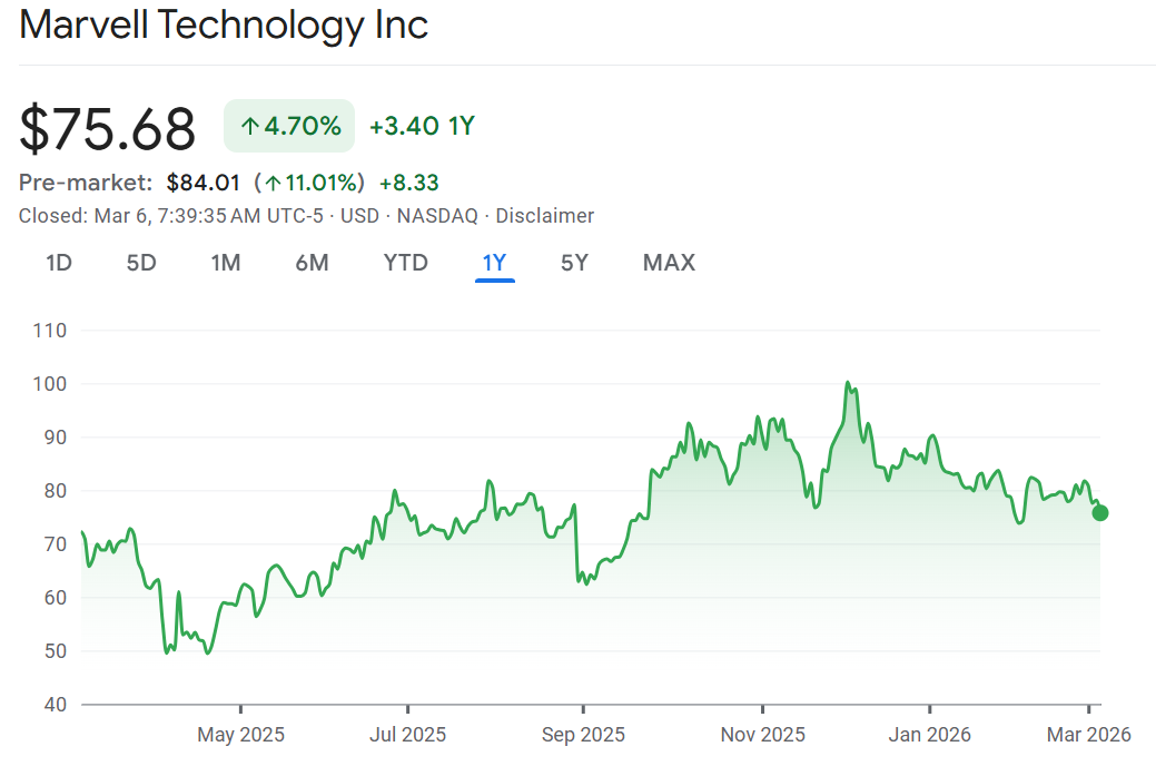 Marvell universe: Shares of Marvell Technologies are soaring 10% after offering a rosy forecast. The chipmaker said its year over year growth will accerlate in every quarter this year thanks to data centre growth. “Marvell faces more controversy and doubt than peers, and we retain conservative estimates despite siding with the bulls,” wrote Simon Leopold of Raymond James. Marvell has underperformed semiconductors on concerns it is losing market share in the custom chip-building business and a concentrated customer base.